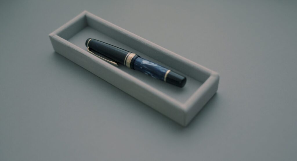 ランコントルを入れているケースは文房具のためのものではなく、無印のアクセサリー用ベロア内箱。万年筆をすぐ使いたいから机に置いてたところ、机の上で行方不明にもなりがちだったのが解消された。写真ではサイズの小さいランコントルを入れてるけど、手持ちの普通サイズの万年筆ならなんでも入る。良い。